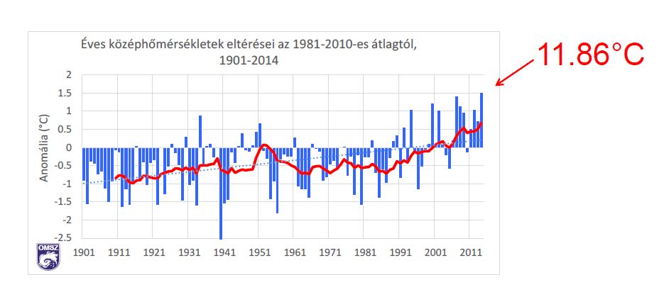 Bár a 110 éves időhorizonton az időjárás évről évre változott, a hőmérséklet folyamatosan emelkedik. A Budapest évi középhőmérsékleteinek sorozatára illesztett lineáris trend szerint – a növekvő urbanizációs hatások következtében is – a melegedés mértéke a fővárosban eléri az 1 Celsius-fokot. A változékonyság ellenére az általános hőmérséklet-emelkedés az utóbbi harminc évben egyértelműen kimutatható.